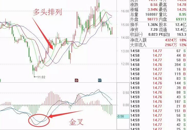 從上圖可以看出,MACD指標(biāo)水下金叉,隨后鱷魚線呈現(xiàn)多頭排列,此時(shí)前期股價(jià)下跌回調(diào)之后不敢買入的投資者此時(shí)可建倉,捕獲接下來剩余的上漲行情。