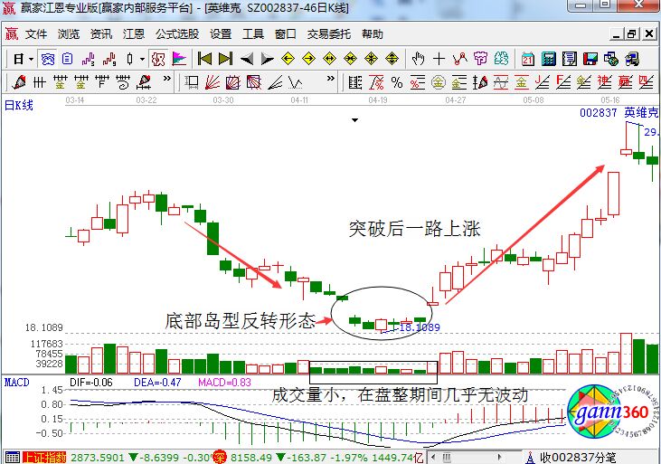 上圖是英維克歷史上的部分走勢(shì)圖,從圖中可以看到,股票下跌趨勢(shì)已經(jīng)接近末端,股價(jià)一個(gè)向下跳空,開(kāi)始了底部盤整,形成了底部反轉(zhuǎn)形態(tài),盤整幾天內(nèi)成交量芝麻大點(diǎn),并沒(méi)有比較大的波動(dòng),在盤整幾日之后,股價(jià)向上高開(kāi)突破,同時(shí)成交量驟然放大,底部島型反轉(zhuǎn)形態(tài)徹底形成后,股價(jià)開(kāi)始持續(xù)上行,短期漲勢(shì)就會(huì)非常驚人。