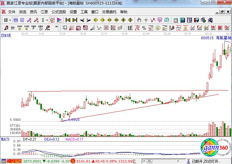 臨門一擊形態(tài)有什么樣的特征?它的主要特征為:盤整時(shí)間比較長,中間會出現(xiàn)3到4次波段位拉伸高點(diǎn),在上軌壓力線處遇阻回落。表象形態(tài)億矩形、三角形、旗形是最常見的。突破之前的盤整形態(tài)多數(shù)表現(xiàn)為縮量運(yùn)行。突破后回踩,觀察是否出現(xiàn)止跌K線,多數(shù)為二次低吸信號。下面我們就來看航?;A(chǔ)的歷史走勢圖。