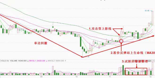如上圖所示,這個反轉(zhuǎn)信號出現(xiàn)了攻擊型上影線外,還是需要兩個輔助量的,即股價站穩(wěn)30日均線,回撤后縮量。
