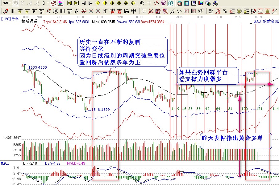 然后引發(fā)了一輪暴跌,但是這次是日線突破重要的壓力線位置,日線開(kāi)始強(qiáng)勢(shì),回踩就有所減免,回踩反而是多單的位置說(shuō)以關(guān)鍵位置還是macd指標(biāo)的構(gòu)成過(guò)程跟下跌的幅度,120分時(shí)間周期中極反通道生命線更跟前期的平臺(tái)位置構(gòu)成了極強(qiáng)的支撐力度,回踩這個(gè)位置不破可以多單。。。。。