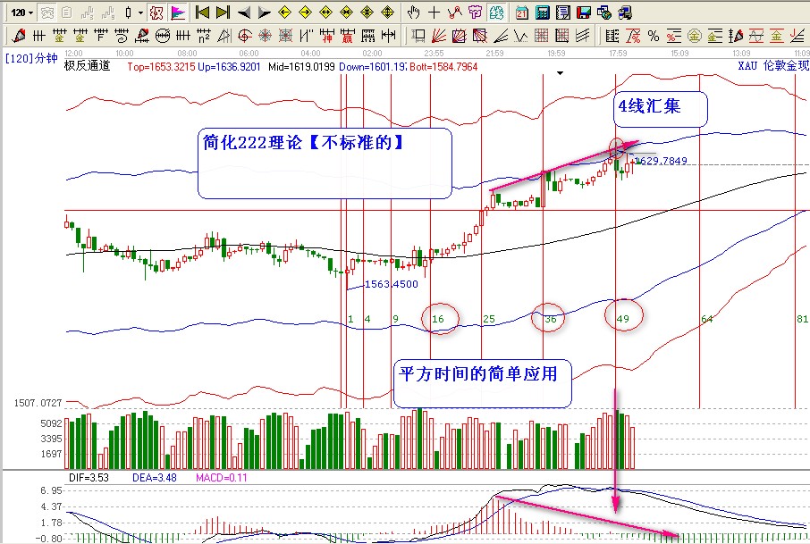 第3個就是平方時間:平方時間循環(huán)線;4【2*2】9【3*3】16【4*4】25【5*5】36【6*6】49【7*7】我們從圖中可以清楚的看到黃金在16 的時間站上生命線然后一路飆升,直到遇到36時間拉出一個大陽線后遇到極反通道上軌壓力經(jīng)行了一個震蕩盤。在49時間極反通道上軌壓力再次遇阻回路,并且收出了一個大陰線。再次證明了時間的神奇之處。