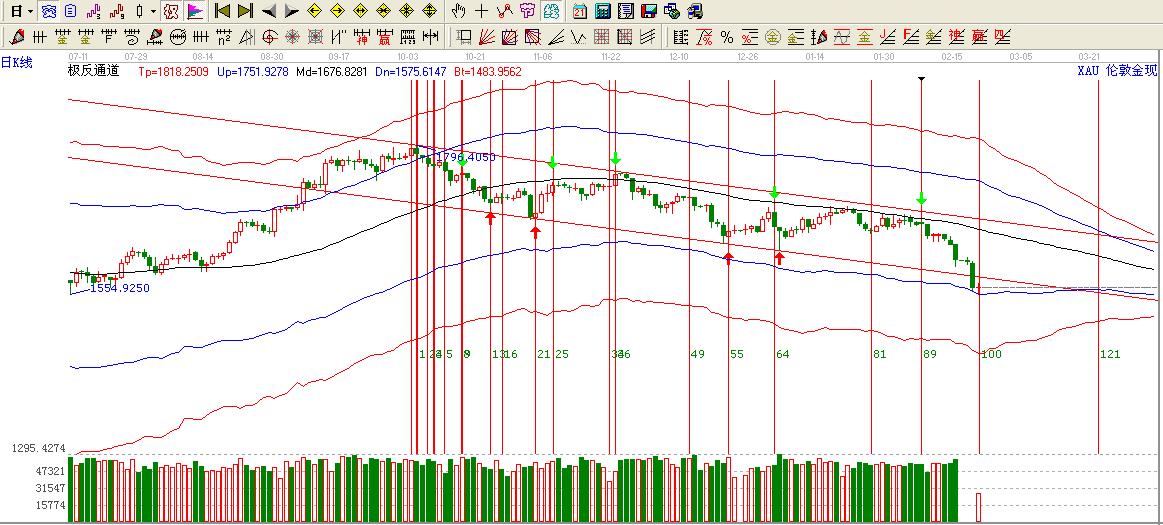 目前黃金處于平方時間10*10=100重要拐點,這個拐點黃金剛剛經(jīng)歷了一波快速殺跌,這里殺跌的的位置剛好是極反通道藍色下軌的位置,這就構成了極反通道跟時間共振的一個拐點。只要極反通道藍色下軌的位置1554.76不破,短期逢低做多為主。。。