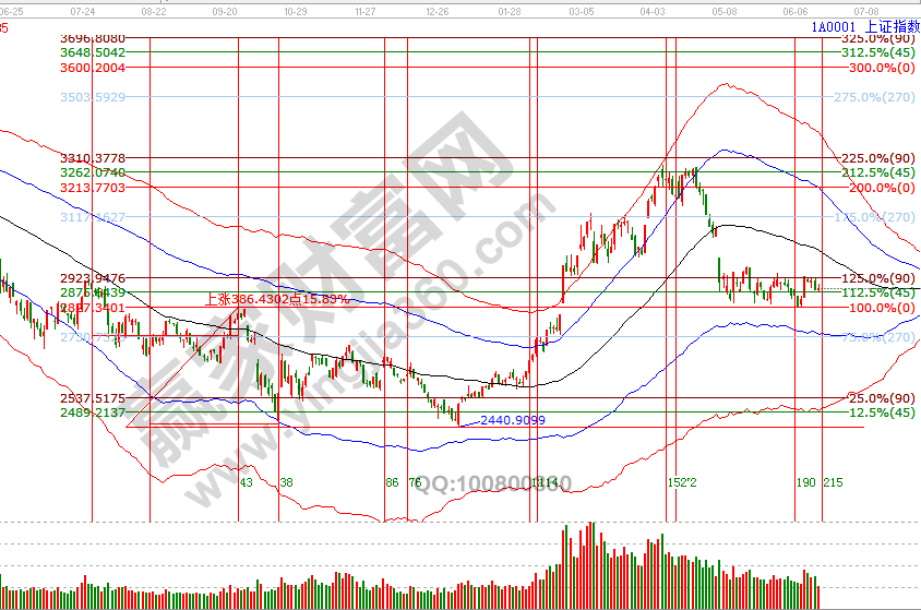 指數(shù)連續(xù)兩個(gè)交易日收盤在贏家江恩系統(tǒng)工具分析的關(guān)鍵區(qū)2880-2890之間,周一盤中擊破2880后收復(fù),此區(qū)間是江恩價(jià)格圖表四方形和60分鐘極反通道生命線,運(yùn)用多周期結(jié)合判斷,關(guān)鍵位不破保持市場延續(xù)反彈的觀點(diǎn)。如受外因不確性因素影響,波段百分比延伸線2834點(diǎn)是強(qiáng)支撐,該位置是近1個(gè)多月來箱體震蕩平臺(tái)下沿,重要性不言而喻。反彈第一目標(biāo)位2950位置,第二目標(biāo)位是日線黑色生命線,在可承受的風(fēng)險(xiǎn)持倉內(nèi)保持平和的心態(tài)應(yīng)對(duì)市場。6月18號(hào)盤中壓力是135度2911點(diǎn)、180度2928點(diǎn),盤中支撐是0度2860、315度2844點(diǎn)。操作策略,指數(shù)處于極反通道弱勢區(qū)域的反彈走勢,繼續(xù)關(guān)注2880-2890區(qū)間得失,整體持倉保持3-5成。