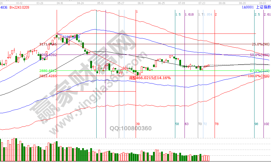 26號指數(shù)收盤正好在江恩價格四方形測算的2944點,保持在極反通道生命線2927點上安全區(qū)域運行,外因與場內(nèi)資金不活躍兩因素,同時上攻期將逐步遇藍(lán)色上軌線反壓力,按時間、空間循環(huán)判斷,維持24號觀點,波段百分比240度2878點支撐,向上反攻第一目標(biāo)是0度2966點,第二目標(biāo)是60分鐘藍(lán)色上軌線,運行時間周期為8月1號。7月29號盤中壓力是270度2961點、315度2978點,盤中支撐是180度2928點、135度2911點。操作策略,指數(shù)極反通道生命線震蕩,信號延續(xù)價格目標(biāo)看60分鐘上軌線,時間周期看8月1號,信號結(jié)束為上證50失守60分鐘生命線,整體持倉保持3成。