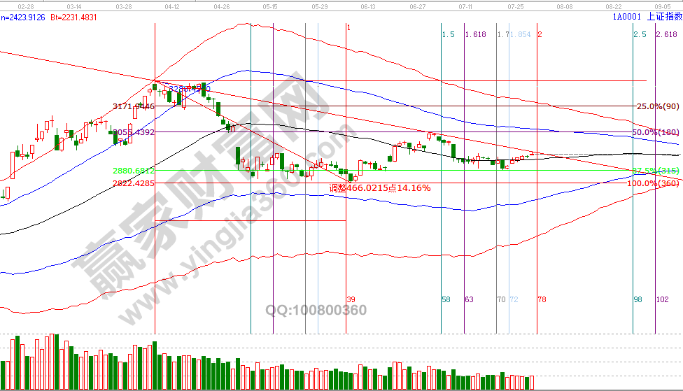 從江恩時間周期角度分析,市場又到了一個日線方向選擇區(qū),回顧近幾個月指數(shù)時間窗口(3月7號、4月8號、5月17號、6月5號、27號、7月3、15、23號),市場的重要級別、次要級別的時間拐點都是提前做出測算并公布,今天收盤后贏家江恩技術(shù)團隊將借助工具分享8月時間窗口,目前公布的第一個是1號(黃金時間周期0.618);價格方面,江恩價格百分比延伸線2倍零度位2966點與240度2878點,是自8號后強調(diào)的具有操作條件的兩個位置,15、23號分別觸及2878點后回升,昨天是上攻至2966點(最高2965相差一個點)回落,結(jié)合趨勢,時間、價格三者綜合判斷,本周后半周持有倉的投資者要關(guān)注好盤面動向,并做好應(yīng)對計劃策略,7月31號盤中壓力是270度2961點、315度2978點,盤中支撐是180度2928點、225度2944點。操作策略,指數(shù)極反通道生命線震蕩,指數(shù)失守60分鐘生命線則反彈信號結(jié)束,向上則關(guān)注60分鐘藍色上軌線也有望形成反彈結(jié)束信號,投資者保持3成。
