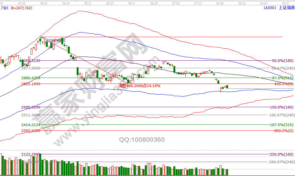 9號(hào)大盤最高點(diǎn)2808點(diǎn)(測(cè)算反壓2808一點(diǎn)不差),最低點(diǎn)2770點(diǎn)(測(cè)算支撐2772,僅相差2點(diǎn)),20年來(lái)贏家江恩大勢(shì)分析均是通過系統(tǒng)工具規(guī)則提前測(cè)算,歷史上重要時(shí)間、價(jià)格拐點(diǎn)都做有判斷,預(yù)判未來(lái)市場(chǎng)最有效的方法就是研究歷史。再談行情,下跌趨勢(shì)已確認(rèn),這在月初已闡述過,未來(lái)市場(chǎng)重要的時(shí)間參考點(diǎn)是9月、空間位置是月線藍(lán)色下軌線(學(xué)員通過極反通道工具獲取位置),這個(gè)觀點(diǎn)是7月中下旬公開課中有講過,當(dāng)前這里定性的是反抽(級(jí)別很小,反彈都稱不上),保持6號(hào)觀點(diǎn)空間上看2744-2822,時(shí)間上9、16號(hào),8號(hào)分析中談到價(jià)格需要等待時(shí)間,本周需要觀察等待期是以時(shí)間換取還是空間換取,因?yàn)榧?jí)別太小,信號(hào)持續(xù)度隨之減弱,周初繼續(xù)觀察日線藍(lán)色下軌線支撐。8月12號(hào)盤中壓力是180度2800點(diǎn)、135度2786點(diǎn),盤中支撐是45度2757點(diǎn)、0度2743點(diǎn),日線時(shí)間窗口是16號(hào)。操作策略,指數(shù)生命線下弱勢(shì)區(qū)域運(yùn)行,藍(lán)色下軌線震蕩,激進(jìn)者最多3成倉(cāng)交易,穩(wěn)健者空倉(cāng)休息。