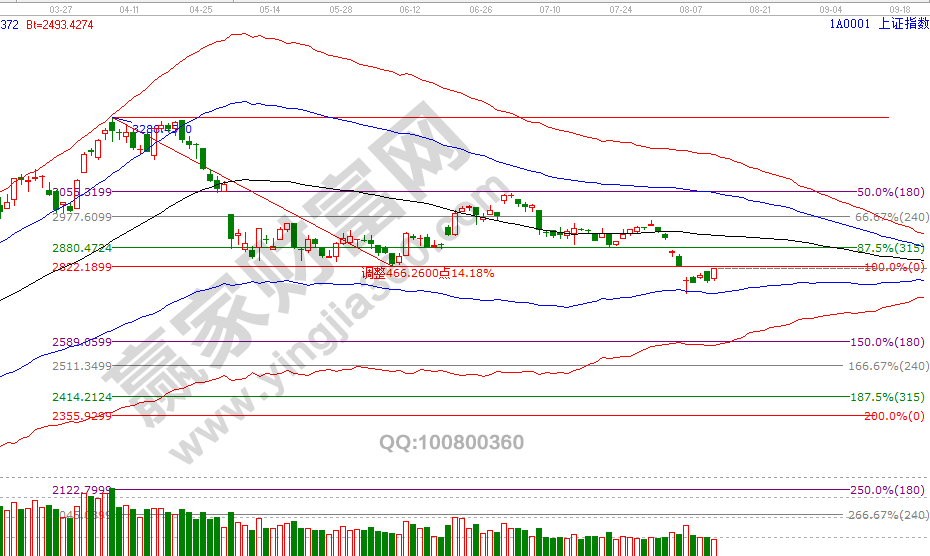 指數(shù)自6號(hào)觸及極反通道藍(lán)色下軌線2744點(diǎn)獲得支撐后展開(kāi)反抽已有5個(gè)交易日,按時(shí)價(jià)等倍關(guān)系測(cè)算空間運(yùn)行不足一半,從這一點(diǎn)說(shuō)明市場(chǎng)反抽力量之弱。短周期15分鐘藍(lán)色上軌線是2823點(diǎn)(缺口位置是2822點(diǎn)),指數(shù)越向上運(yùn)行遇到反壓級(jí)別越大,日線波段百分比延伸線180度是2834點(diǎn),這也是6號(hào)測(cè)算的2744點(diǎn)、2834點(diǎn)兩個(gè)關(guān)鍵位,反抽時(shí)間還沒(méi)有結(jié)束,震蕩不改反抽目標(biāo)位。8月13號(hào)盤中壓力是270度2829點(diǎn),盤中支撐是180度2800點(diǎn)、2791點(diǎn),日線時(shí)間窗口是16號(hào)。操作策略,指數(shù)生命線下弱勢(shì)區(qū)運(yùn)行,激進(jìn)者3成倉(cāng)交易,穩(wěn)健者空倉(cāng)休息。
