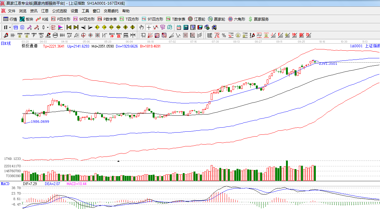 江恩看盤綜述:依據贏家江恩技術工具分析得出:今日指數圍繞外軌線震蕩,終盤以陰十字星報收,近期指數高位滯漲以及盤中震蕩加劇,而且macd有高位背離的走勢,,下周重點關注日線藍色外軌線的得失,此位置如破位,預計市場會出現幾天的日線級別調整,但以中線而言,短線的調整并不改變反彈趨勢,目前操作策略上做好倉位的調整保持3-5成左右。