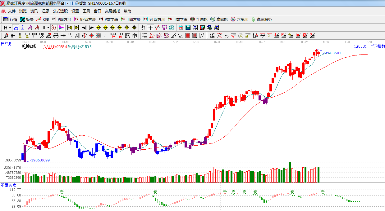 ★依據贏家江恩系統(tǒng)乾坤K線提示:幾日盤中回踩綠色出局線,依據規(guī)則綠色出局線之上短線看多,之下短線看空。