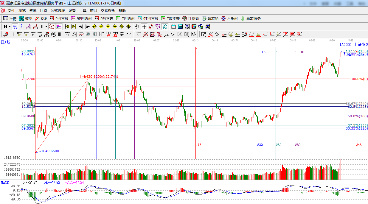 ☆依據(jù)贏家江恩系統(tǒng)波段百分比提示:指數(shù)繼續(xù)震蕩走高,強(qiáng)勢(shì)突破120度2410點(diǎn),下一目標(biāo)位是135度2428點(diǎn),180度是2480點(diǎn)。