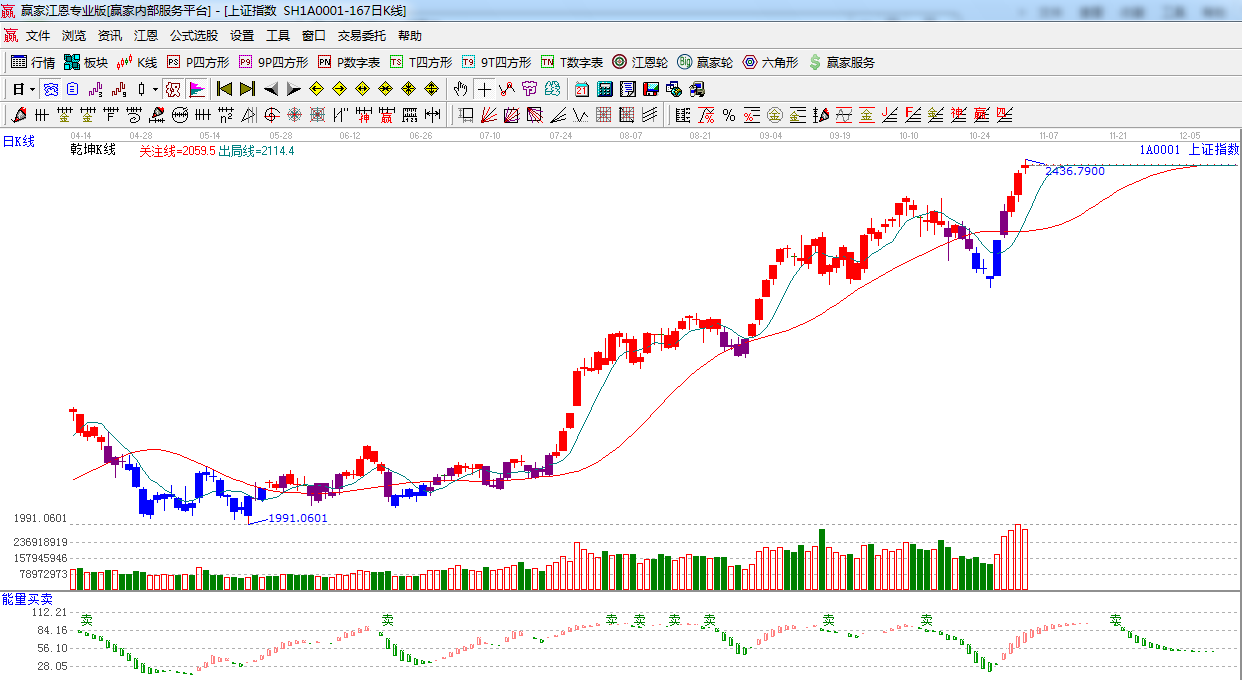 ★依據(jù)贏家江恩系統(tǒng)能量買賣提示:紅色看多能量柱增長(zhǎng),看多。