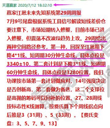 7月12號贏家江恩VIP學(xué)員周報內(nèi)容如下圖,本周第一種路徑關(guān)鍵位3340±10,第二種路徑關(guān)鍵位3280點。7月14號午盤分析對關(guān)鍵位再度進行解讀。