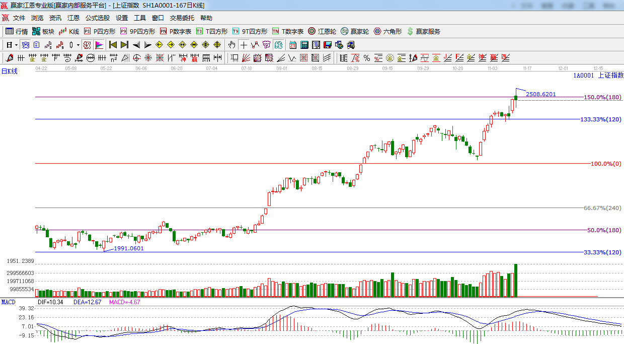 咨詢:13333833889周二早盤延續(xù)昨日強勢,在銀行,券商的帶領(lǐng)下突破2500點,午后開盤開始跳水,終盤以十字星報收,成交量突破5800億元,創(chuàng)歷史成交紀(jì)錄。