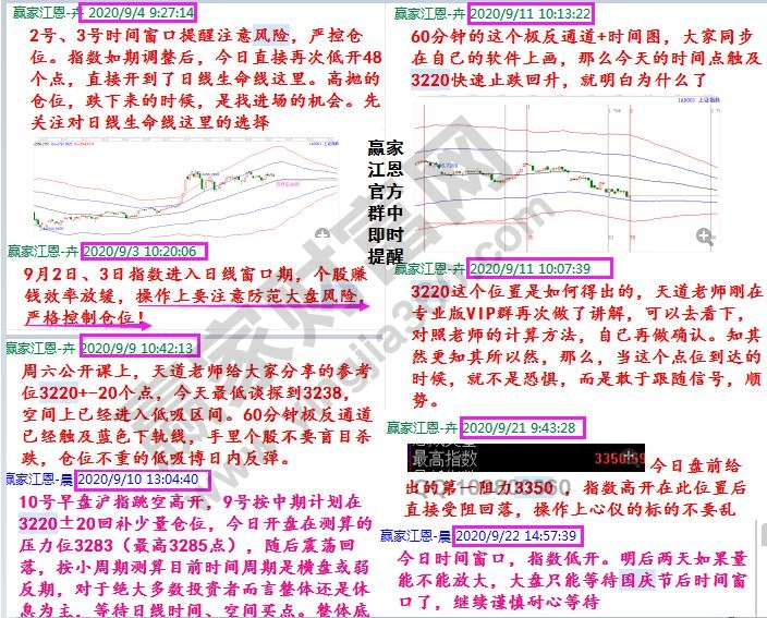 2020年一季度大盤反復摔打創(chuàng)年內(nèi)低點2646點、二季度小碎步攀升、三季度強勢上攻隨后轉(zhuǎn)入修整,四季度行情拉開序幕、蓄勢待發(fā)。8、9月份市場在箱體區(qū)間內(nèi)運行,贏家江恩團隊在正式學員群提前給出箱體策略,原話如下“在一個箱體區(qū)間里做滾動交易--底倉+活動倉,不會輕易的去追漲,而是對持續(xù)跟蹤的標的(日或周強勢區(qū)域)調(diào)整幾天后用活動倉參于,上漲到別人想追時賣出?!?/span>學員可在群中搜索“箱體”回顧提出時間進行思考,為何能提前于市場走勢之前就提出相應(yīng)的策略?當你你又是如何打算的呢?后知后覺者永遠是賣單者,大家看看自己的賬戶,是不是9月份把今年賺的都還給市場了,其中應(yīng)該不少人8月份就還了利潤,9月份還虧了本金。如這樣都不能讓你明白,擁有一套“投資體系”的重要性,那再來一波牛市,賺的錢最終也不是你的。如果你跟隨專業(yè)的團隊進行學習,在9月初2號、3號時間窗口,提醒降低倉位時控制倉位,不僅保住了利潤還可以根據(jù)工具信號在9月11日3220時價點做一個反彈,同樣贏家江恩團隊提前測算出3350壓力,9月底指數(shù)再探3200附近,分鐘圖再現(xiàn)時價四方信號。