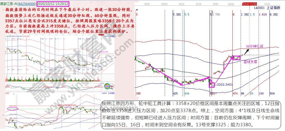 對照當下回顧歷史,在提前預測和實際走勢的對比中,學習感悟江恩時空技術(shù)的魅力。12日大盤分析,指數(shù)到達預期關(guān)鍵位3358點,進入壓力區(qū)間。但,日線時間并未走完,空間還有反復,不破3325點仍屬強勢,可繼續(xù)把握個股機會。實則,13日指數(shù)直接低開下探,回踩日線生命線3330一線后,止跌回升再次沖擊3358。全天呈震蕩態(tài)勢,符合預期分析,等待日線下個時間窗。