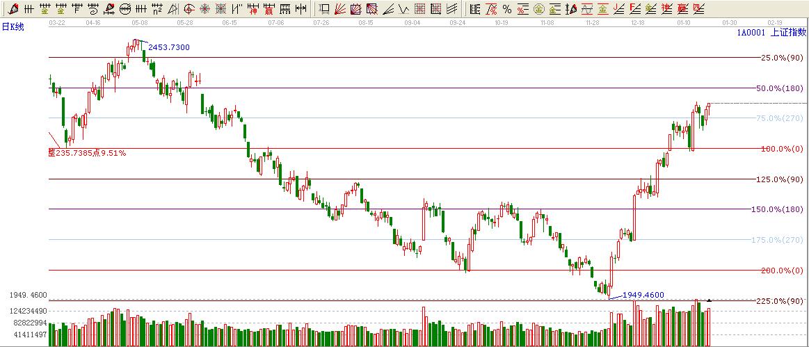 綜上所述:大盤運行在波段百分比延伸線270度位置上方,上方壓力180度位置。270度位置不破看高一線。