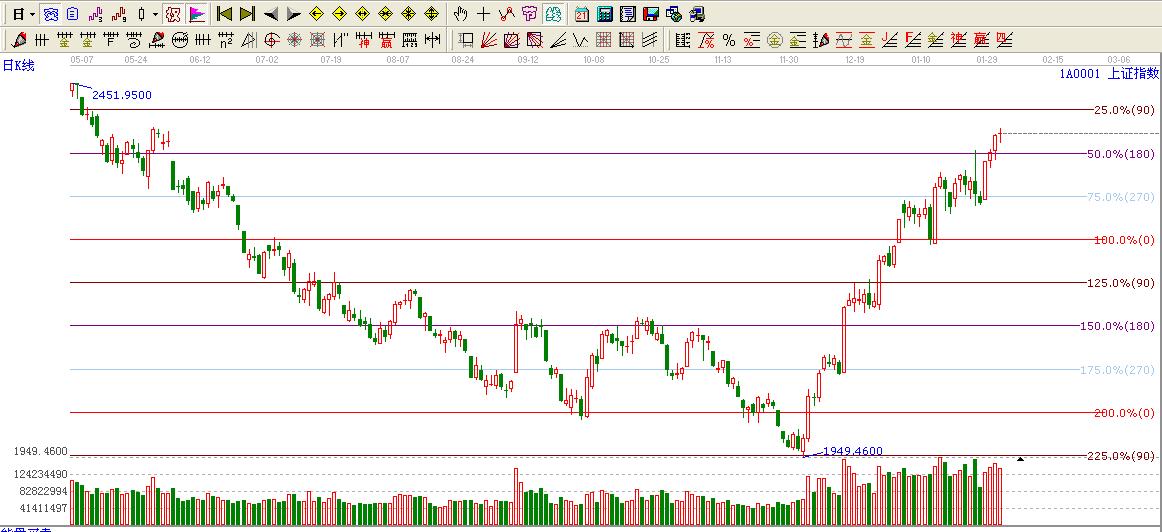 ★依據(jù)贏家波段百分比伸線提示:大盤依然運行在在180度2360壓力上方,構(gòu)成短期支撐。只要不破這里看高至90度位置2420附近。
