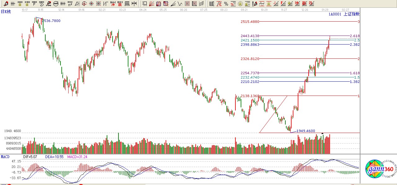 綜上所述:大盤(pán)極反通道藍(lán)色上軌位置不破,按照極反通道應(yīng)用法則看高一線至2457點(diǎn),短期黃金分割2.382位置震蕩難免。