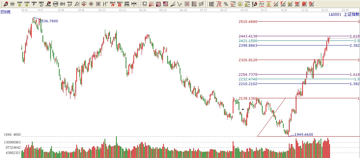 綜上所述:大盤極反通道藍(lán)色上軌位置不破,按照極反通道應(yīng)用法則看高一線至2457點(diǎn),短期黃金分割2.382/2.618位置震蕩難免。