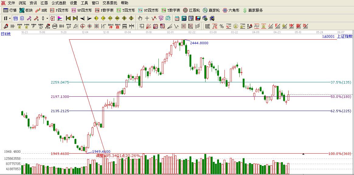 ☆依據(jù)江恩波段百分比提示:大盤如期構(gòu)筑小雙底再度運(yùn)行在其180度位置2197點(diǎn)上方,按照規(guī)則這里不破有望挑戰(zhàn)135度位置2259點(diǎn)高點(diǎn)。