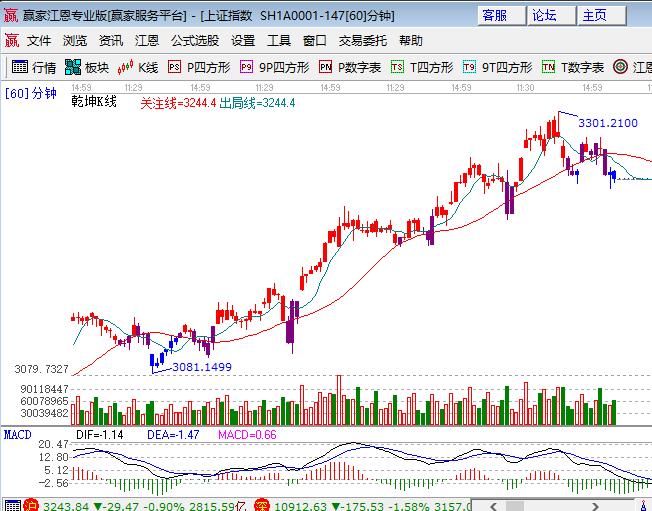 依據贏家江恩系統(tǒng)分析:上周五大盤低開回補缺口后一路震蕩下跌,攪局者石化雙雄開盤即大漲盤中一度沖擊漲停,給種一種大盤股輪漲結束的信號,深成指和中小創(chuàng)跌幅在1%以上,板塊除石油外普跌,券商領跌權重;題材無表現,次新、高送轉、稀土等領跌,個股下跌居多成交量略微放大。技術方面,日線失守股票分析軟件江恩百分比45度3271點后回踩0度3234點,下方是315度3197點。極反通道日線外軌線和江恩百分比0度是同一位置,引線跌破波段上回調目標是日線生命線3170附近,操作上保持謹慎操作,我們11月23號減的波段倉籌碼等待回補信號的出現,短線減少操作頻率,3211、3191為日內支撐,3255、3265為日內阻力,僅供參考,不構成任何投資建議。