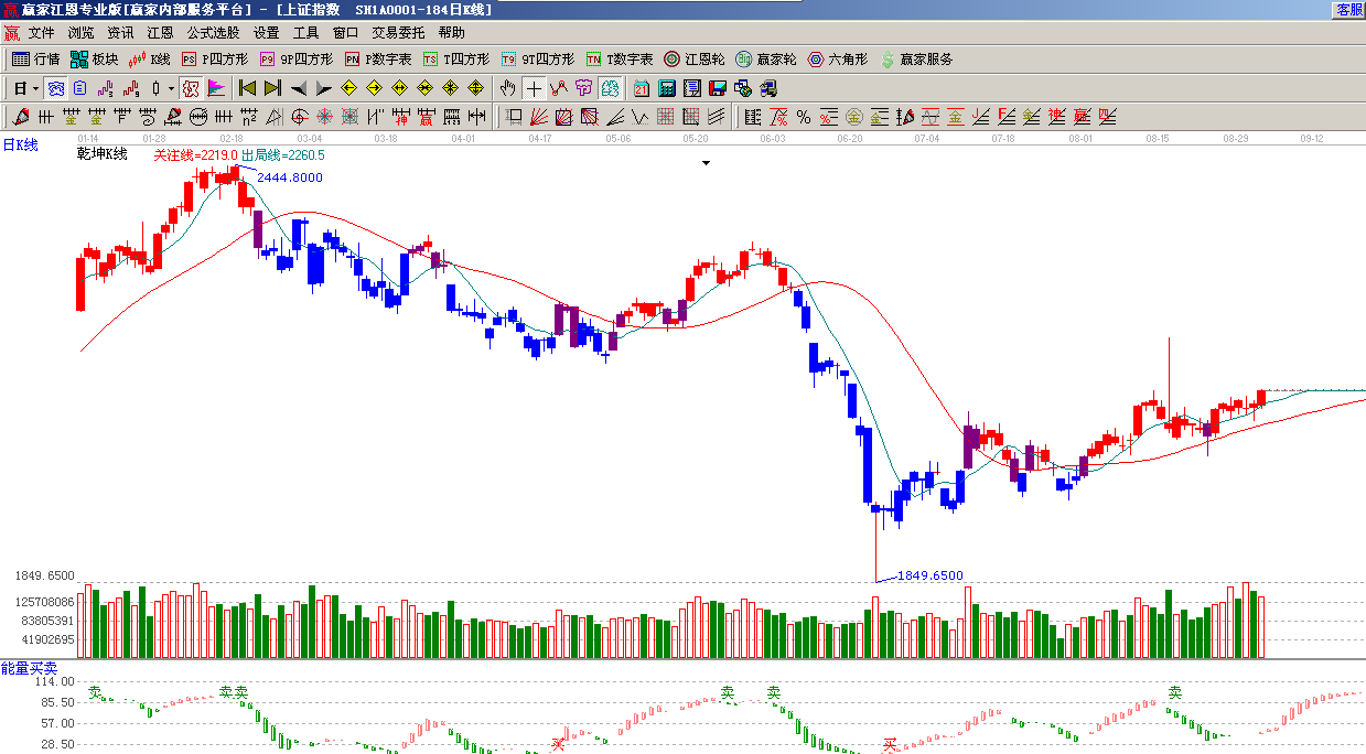 ★依據(jù)贏家江恩系統(tǒng)能量買賣提示:多頭當前占據(jù)優(yōu)勢,主現(xiàn)紅色柱子;(1)