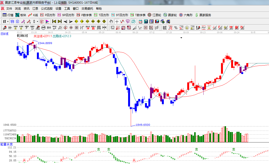 ☆依據(jù)贏家江恩系統(tǒng)能量買賣提示:多空轉(zhuǎn)換區(qū),等待紅色柱;