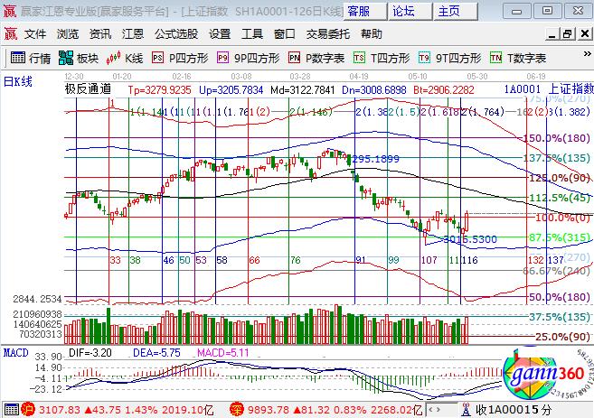 周四大盤低開高走放量大漲1.43%,權(quán)重集體發(fā)力意味著調(diào)整暫時(shí)告一段落,后勢(shì)主基調(diào)二八能否平分秋色,待市場(chǎng)揭曉答案。板塊方面,大金融、煤炭、地產(chǎn)、石油等權(quán)重輪番表演,環(huán)保和家電逆勢(shì)下跌;題材方面,雄安概念一枝獨(dú)秀,次新最弱,個(gè)股上漲居多但二八分化嚴(yán)重。技術(shù)方面,日線突破江恩百分比零度3097點(diǎn),上方45度位置3150是近期上漲阻力位置,當(dāng)前位處于極反通道弱勢(shì)外軌線和生命線懸空位置,短期遇強(qiáng)勢(shì)外軌線壓力,盤中預(yù)計(jì)圍繞零度位置上下震蕩,盤面上工農(nóng)中建尾盤甩貨,看商業(yè)銀行是否接力,主板白馬板塊啟動(dòng)以后,至少不會(huì)嘎然而止,熱點(diǎn)切換到8股則盤面賺錢效應(yīng)激活。存量資金博弈,生命線是前行的重要阻力,整體倉(cāng)位保持在5成,,3097、3080為日內(nèi)支撐,3125、3150為日內(nèi)阻力,僅供參考,不構(gòu)成任何投資建議。
