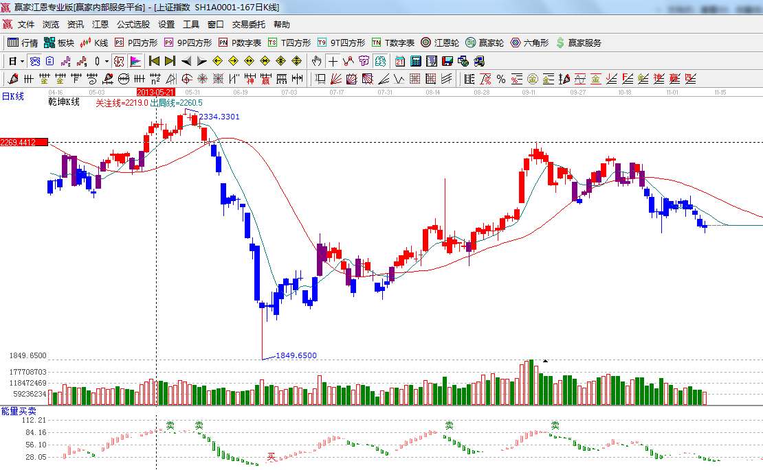 ☆依據(jù)贏家江恩系統(tǒng)能量買賣提示:多空轉(zhuǎn)換節(jié)點(diǎn)位置,出現(xiàn)綠柱子信號(hào)空方占優(yōu);