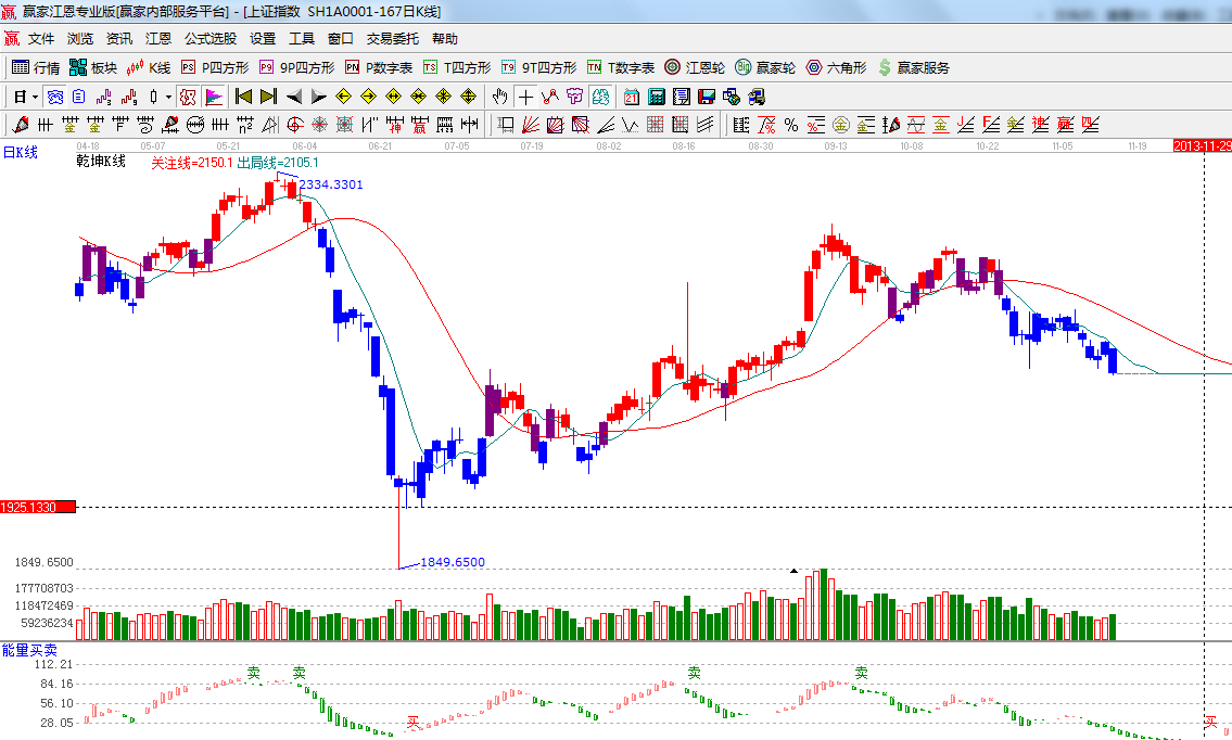 ☆依據(jù)贏家江恩系統(tǒng)乾坤K線提示:藍色K線為休息區(qū),出局線、關(guān)注線空頭排列;