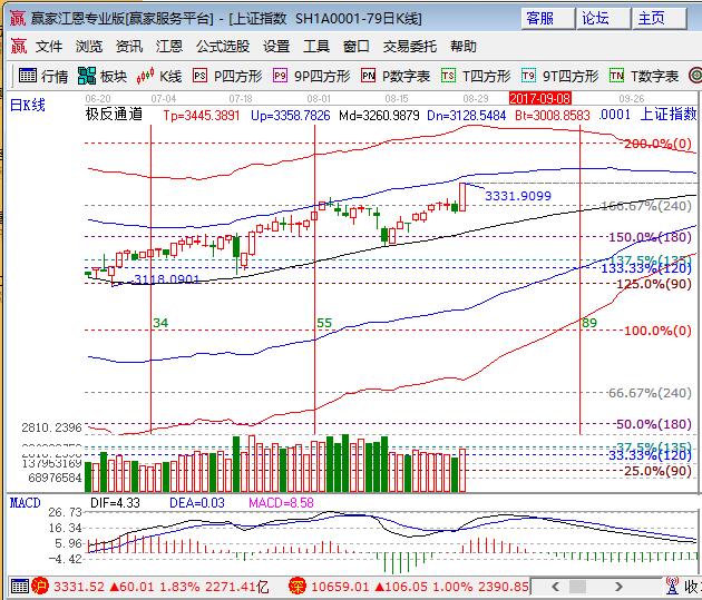 咨詢:13333833889上周五大盤創(chuàng)17年單日最大漲幅創(chuàng)新高,深市相對較弱但漲幅也在1%左右。板塊普漲,三大金融保險、銀行、券商全線大漲,有色煤炭漲幅靠前,釀酒、環(huán)保、醫(yī)藥漲幅墊底;題材方面,次新和5G概念走勢引領概念,蘋果和地熱概念較弱,個股幾近普漲僅300余只個股下跌,成交量較前日有所放大。技術方面,滬指中陽日K線突破并站在江恩百分比240度位置上方,極反通道外軌線位置是3350附近,短期15/30分鐘K線收在外軌線位置,60分鐘外軌線與日線點位基本一致,操作上波段、短線結合操作,滬深兩市預計將輪番表現(xiàn)震蕩上行,波段倉位控制在4成,短線倉3成,3320、3310為日內支撐,3348、3260為日內壓力。僅供參考,不構成任何投資建議。