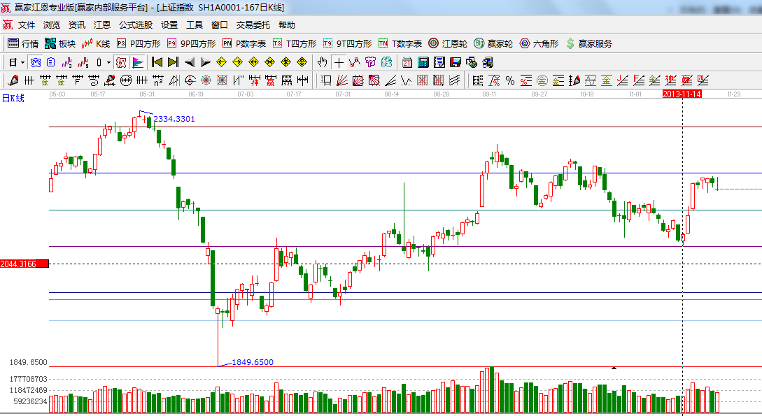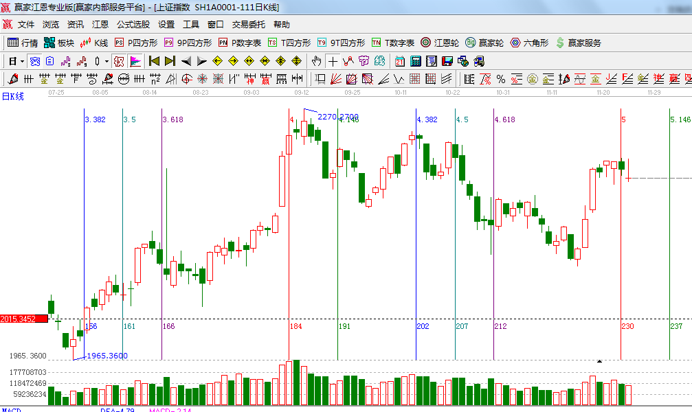 ☆依據(jù)贏家江恩系統(tǒng)波段百分比延伸提示:2444與1849點做黃金分割價格圖,0.382位置是2217點,0.5位置是2150點;