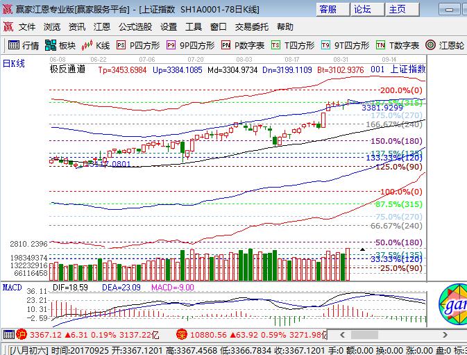 咨詢:13333833889大盤上周五高開沖高回落震蕩收陽十字星,深成指和中小創(chuàng)漲幅在0.5%以上,大于滬指漲幅。板塊方面,煤炭、鋼鐵、有色板塊領(lǐng)漲,權(quán)重僅券商跑贏大盤,銀行、保險領(lǐng)跌;題材方面,科技股國產(chǎn)軟件、人工智能、網(wǎng)安和次新表現(xiàn)不錯,周期資源股、上海國改、金磚會議走勢較弱,個股漲多跌少成交量放量突破3100量。技術(shù)方面,滬指日線收盤略高于外軌線(3365點)2個點,短期15分鐘收在生命線,30、60分鐘逐級向生命線靠攏,江恩百分比270度是3320點,315度是3370點,預(yù)計滬指繼續(xù)圍繞外軌線上下震蕩,本周回補下方缺口的概率較大,因此操作上不追高,等待回撤后的機會,波段倉位控制在4成,短線倉2成,3350、3340為日內(nèi)支撐,3374、3280為日內(nèi)壓力。僅供參考,不構(gòu)成任何投資建議。