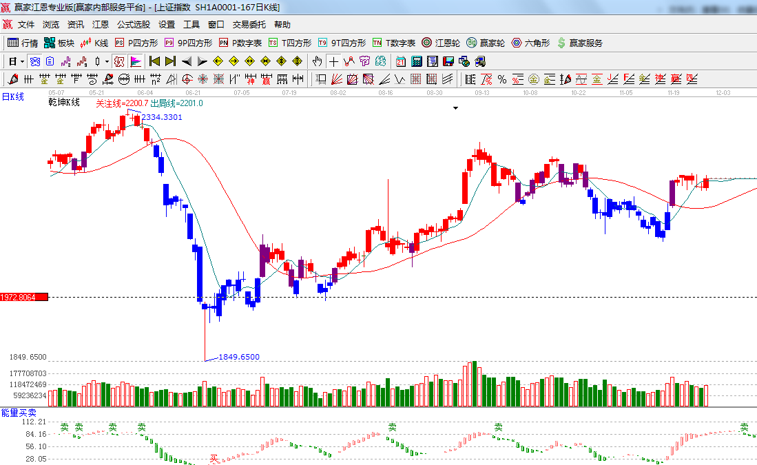 ★依據(jù)贏家江恩系統(tǒng)乾坤K線提示: 收盤價在藍色短期出局線上,繼續(xù)看多;