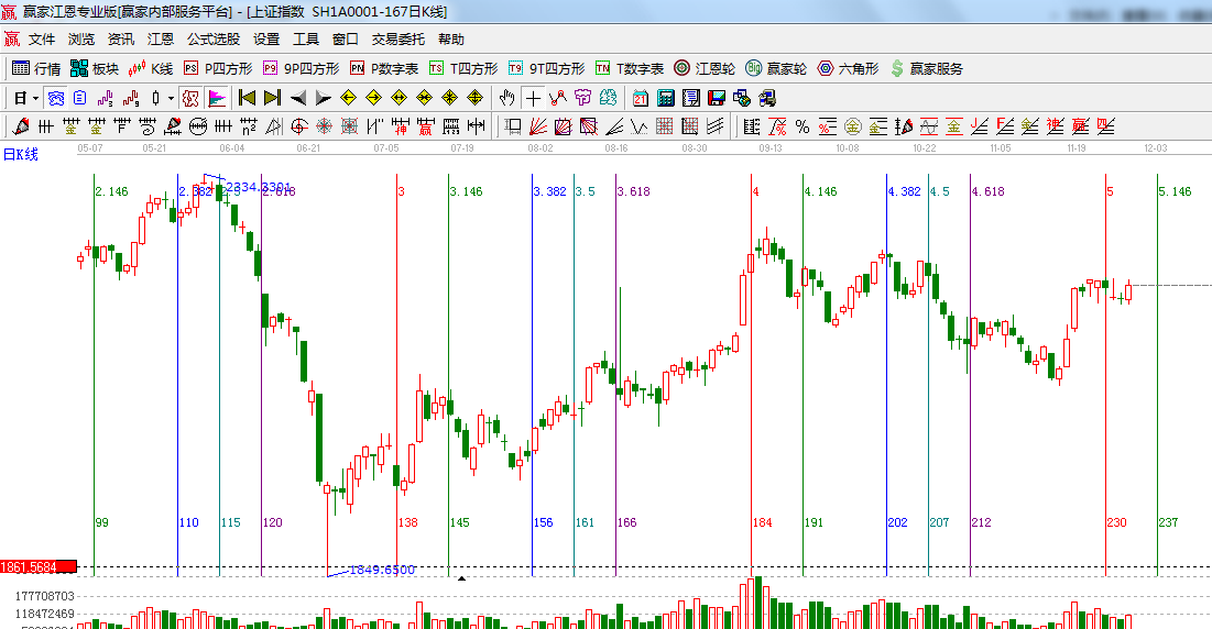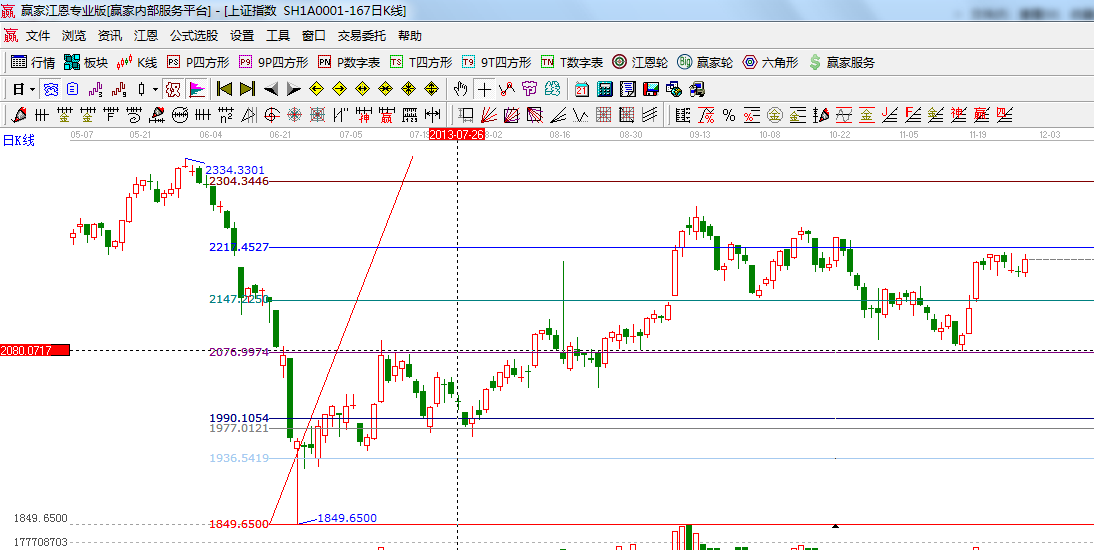 ☆依據(jù)贏家江恩系統(tǒng)波段百分比延伸提示:2444與1849點做黃金分割價格圖,0.382位置是2217點,0.5位置是2150點;