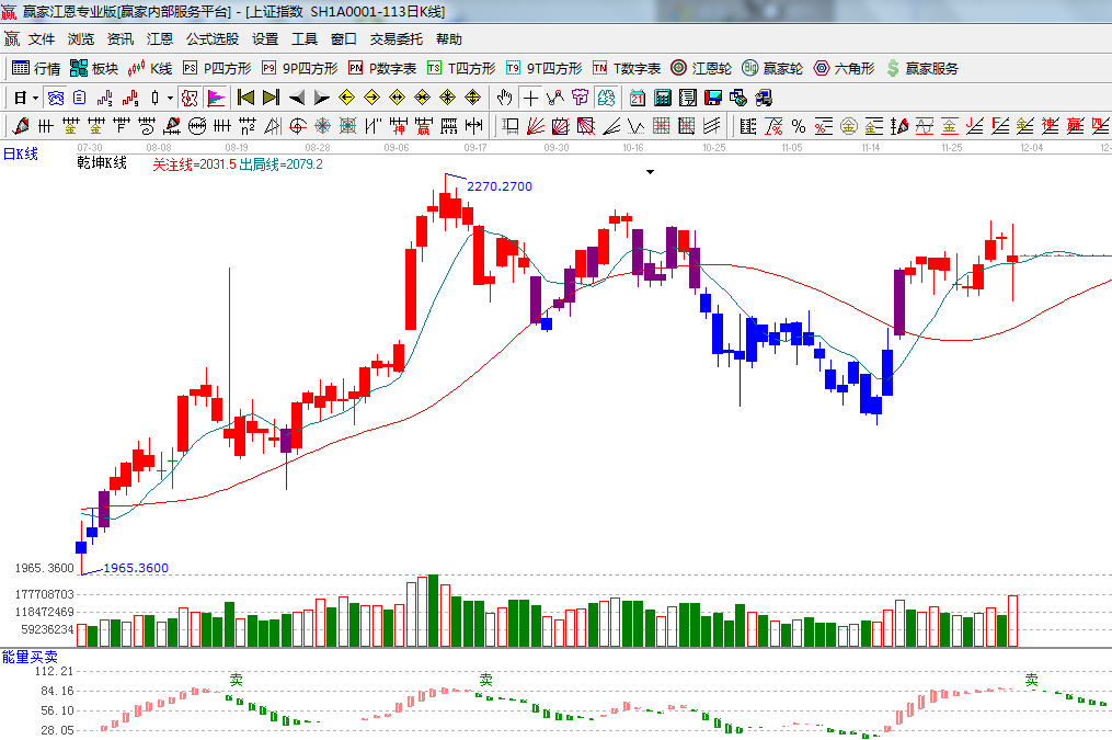 ★依據(jù)贏家江恩系統(tǒng)乾坤K線提示: 關(guān)注線、出局線多頭排列,收盤藍(lán)色短期出局線上,繼續(xù)看多;