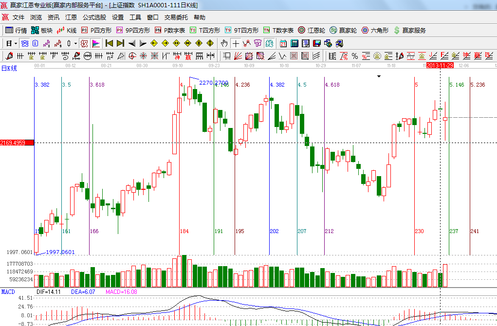 ☆依據(jù)贏家江恩系統(tǒng)波段百分比延伸提示:2444與1849點(diǎn)做黃金分割價(jià)格圖,0.382位置是2217點(diǎn),下方支撐為0.5位置2150,上方拋壓在前期頭部2265附近;