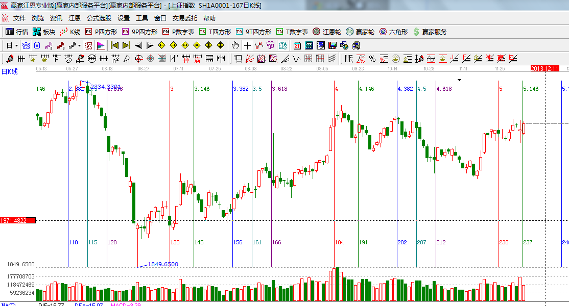☆依據(jù)贏家江恩系統(tǒng)波段百分比延伸提示:2444與1849點做黃金分割價格圖,0.382位置是2217點,下方支撐為0.5位置2150,上方拋壓在前期頭部2265附近;