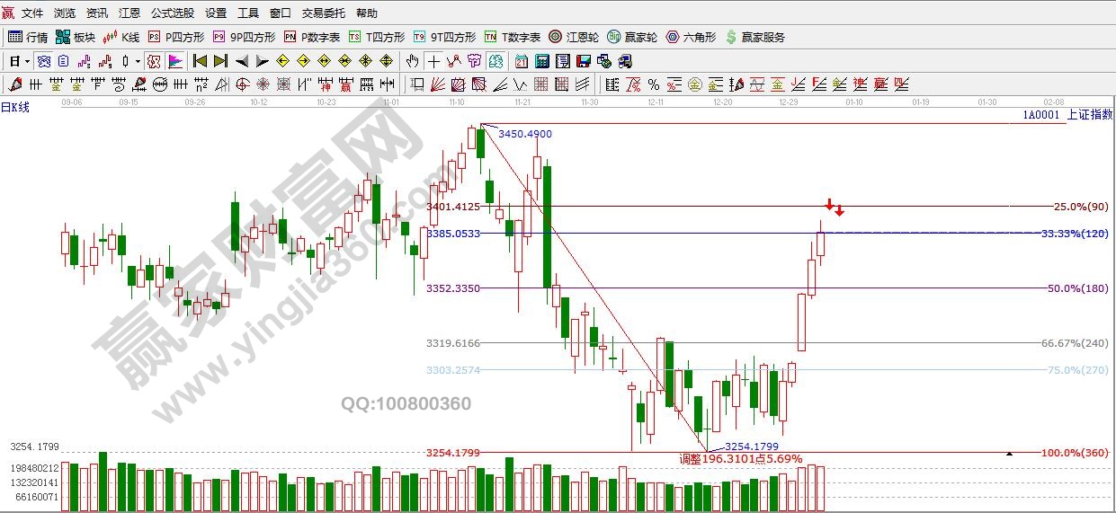 江恩看盤綜述:依據(jù)贏家江恩技術(shù)工具分析得出:周四,指數(shù)再創(chuàng)近期反彈新高,但市場展開分化,在“兩桶油”的強(qiáng)拉升下,指數(shù)也呈現(xiàn)上漲乏力跡象。依據(jù)百分比分析,指數(shù)連續(xù)上攻已經(jīng)接近前期套牢區(qū),點(diǎn)位在3385--3400區(qū)間(百分比120度--90度之間),預(yù)計短期指數(shù)或?qū)_高回落,結(jié)束短期反彈走勢,回調(diào)空間需要關(guān)注其力度和市場承接性,支撐關(guān)注日線生命線3345點(diǎn)附近。所以,不建議再次追進(jìn),同時逢高適當(dāng)減倉下等待回落低吸良機(jī)。