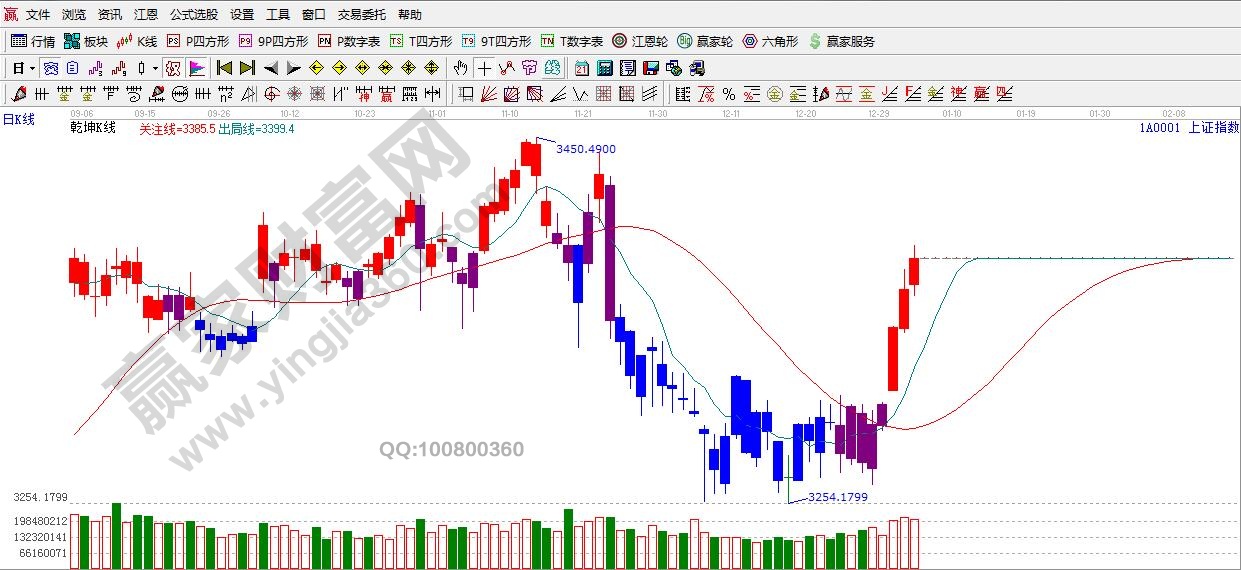 ★依據(jù)贏家江恩理論系統(tǒng)乾坤K線提示:紅色關(guān)注線之上,出現(xiàn)紅色k線,依據(jù)規(guī)則,趨勢多頭。