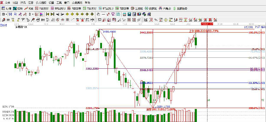 ★依據(jù)贏家江恩理論系統(tǒng)江恩波段百分比提示:滬指在創(chuàng)日線新高,短線支撐依舊是3401點,以及240度3380附近。