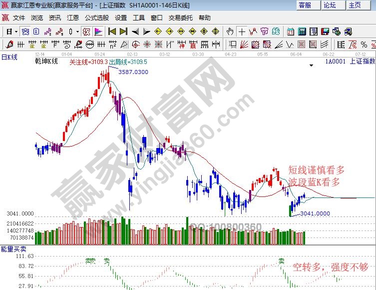 ☆依據(jù)贏家江恩理論系統(tǒng)乾坤K線提示:藍(lán)色K線代表波段休息,收盤保持在短期出局線3100點(diǎn)上方,短線謹(jǐn)慎看多波段看空。