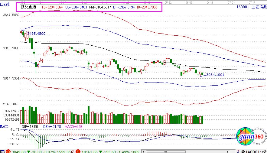 滬指跌0.97%,報收3049點;深成指跌1.49%,報收10161點;創(chuàng)業(yè)板跌1.57%,報收1685點。盤面上看,鋼鐵、海南等少數(shù)板塊上漲;中韓自貿(mào)區(qū)、小米概念、無線充電、次新股、送轉(zhuǎn)填權(quán)、醫(yī)療器械等板塊下跌。全天,滬股通凈流入7.8億元,深股通凈流入7.3億元。相應(yīng)的極反通道指標的支撐壓力提示,如下圖所示: