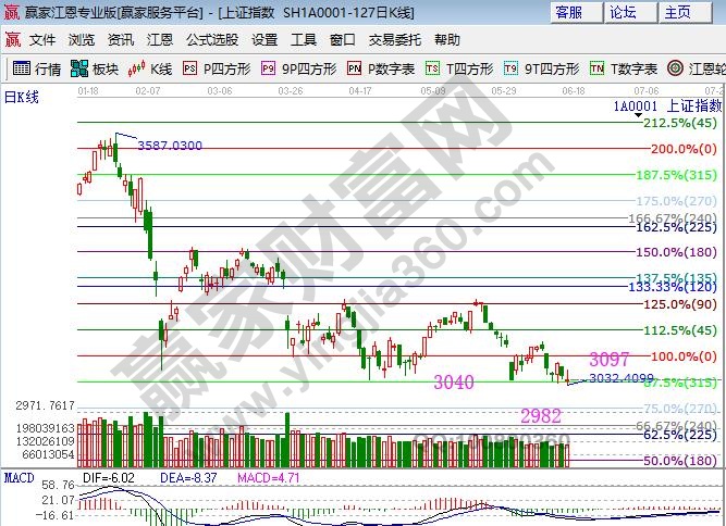 ★依據(jù)贏(yíng)家江恩理論系統(tǒng)波段百分比延伸線(xiàn)提示:日線(xiàn)再探315度3040位置,明日觀(guān)察此線(xiàn)支撐,此線(xiàn)不破上方阻力是零度3097點(diǎn),失守則下方是2982點(diǎn)。