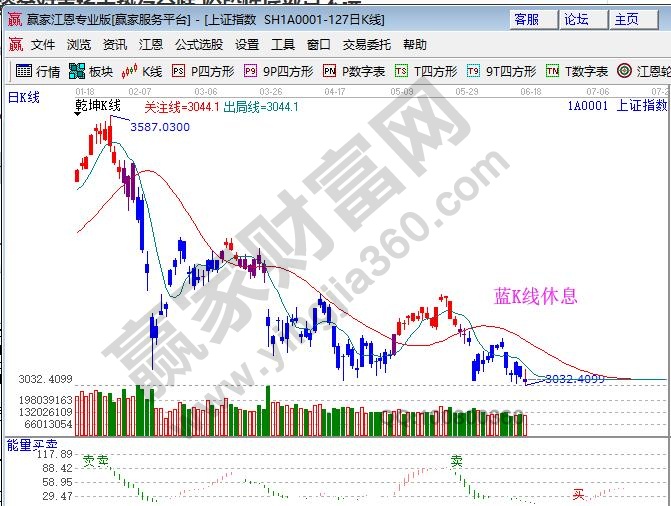 ☆依據(jù)贏(yíng)家江恩理論系統(tǒng)乾坤K線(xiàn)提示:藍(lán)色K線(xiàn)代表波段休息,收盤(pán)價(jià)在短期出局線(xiàn)下運(yùn)行,短線(xiàn)、波段看空。