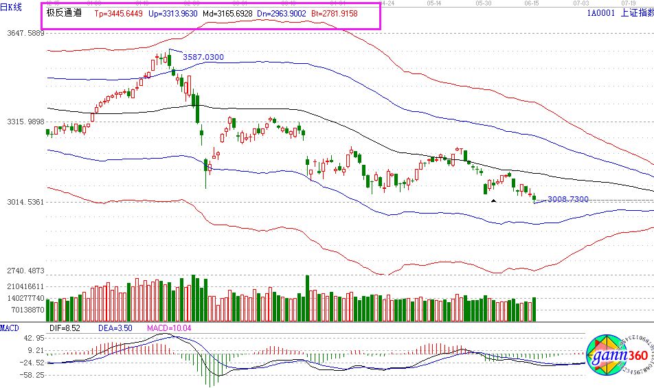 滬指跌0.73%,報收3021點;深成指跌1.40%,報收9943點;創(chuàng)業(yè)板跌1.89%,報收1641點。盤面上看,煤炭、銀行、粵港澳自貿區(qū)等少數板塊上漲;石油、啤酒、海南、知識產權保護、生態(tài)農業(yè)、服裝紡織等板塊下跌。全天,滬股通凈流入22億元,深股通凈流入6億元。相應的極反通道指標的支撐壓力提示,如下圖所示:
