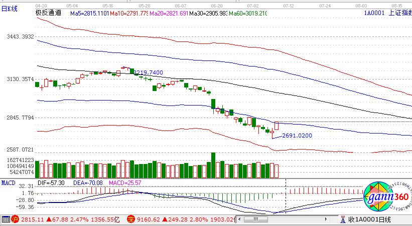 滬指漲2.47%,報2815點;深成指漲2.80%,報9160點;創(chuàng)業(yè)板指漲2.64%,報1581點。盤面上看,草甘膦、醫(yī)藥商業(yè)、可燃冰、水泥、鈦白粉、石墨電極、化工新材料、次新股等板塊漲幅居前。滬股通凈流入25億,深股通凈流入11億。相應的極反通道指標的支撐壓力提示,如下圖所示: