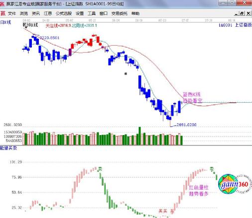 ☆依據(jù)贏家江恩理論系統(tǒng)乾坤K線提示:藍(lán)色K線,波段趨勢(shì)仍為空。