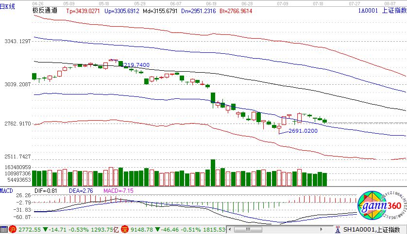 滬指跌0.53%,報收2772點;深成指跌0.51%,報收9148點;創(chuàng)業(yè)板跌1.11%,報收1590點。從板塊漲幅上看,鋼鐵、高送轉(zhuǎn)、水泥、尾氣治理等少數(shù)上漲;農(nóng)業(yè)、機場航運、在線旅游、海南、黃金等板塊跌幅居前。滬股通凈流入18億,深股通凈流入8.7億。相應(yīng)的極反通道指標(biāo)的支撐壓力提示,如下圖所示: